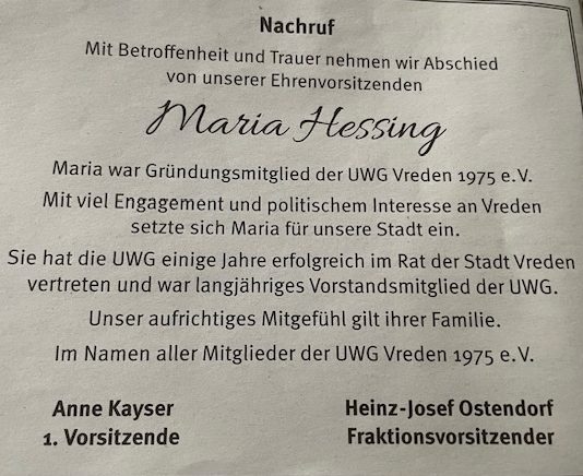 Maria war Gründungsmitglied der UWG Vreden 1975 e.V.